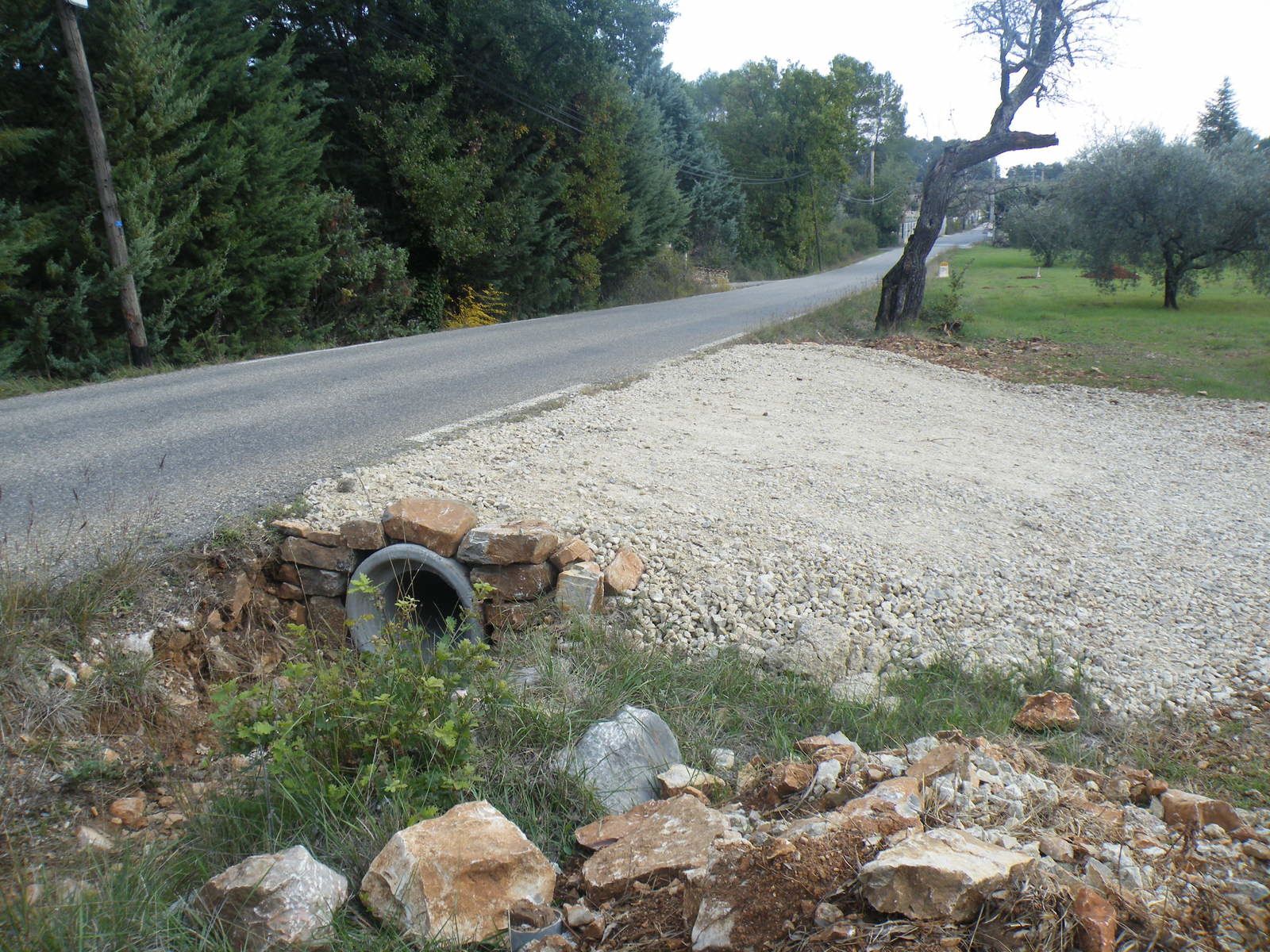 Elle consiste en la pose, dans le fossé longeant la route, d'une série de buses en béton armé, sur une dizaine de mètres de longueur et déversement d'un peu de tout-venant (granulats de 0 à 20 mm de diamètre).